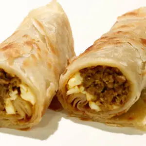 Beef kabab, Boom Boom sauce, melted cheese, fresh salad mix, soft paratha wrap, and light seasoning.