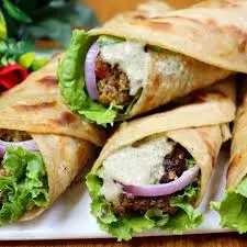 Beef kabab, melted cheese, fresh salad mix, soft paratha wrap, and light seasoning.