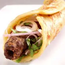 Beef kabab, fresh salad mix, soft jumbo paratha wrap, and light seasoning.