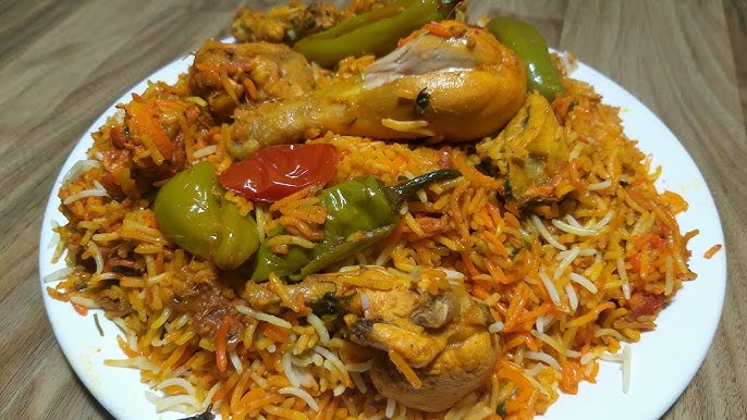 Chicken, basmati rice, onions, tomatoes, yogurt, green chilies, biryani spices, coriander, and mint.